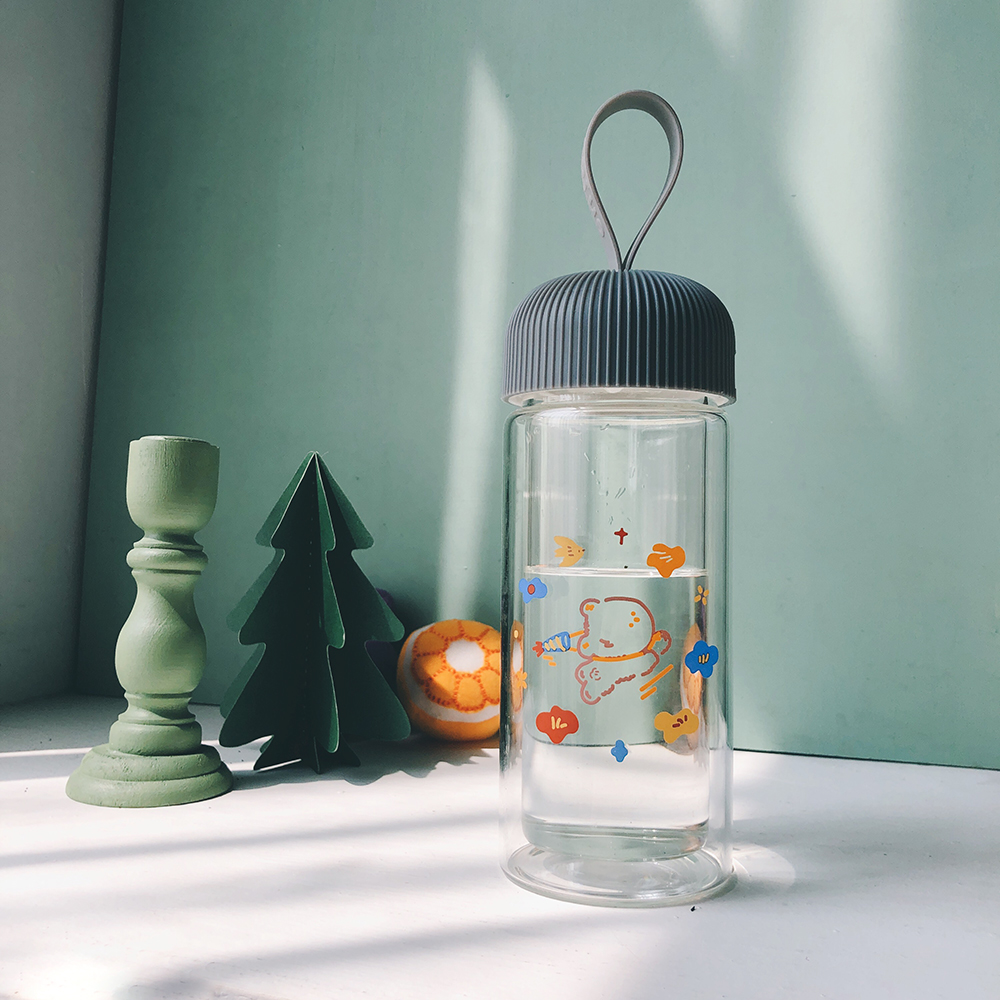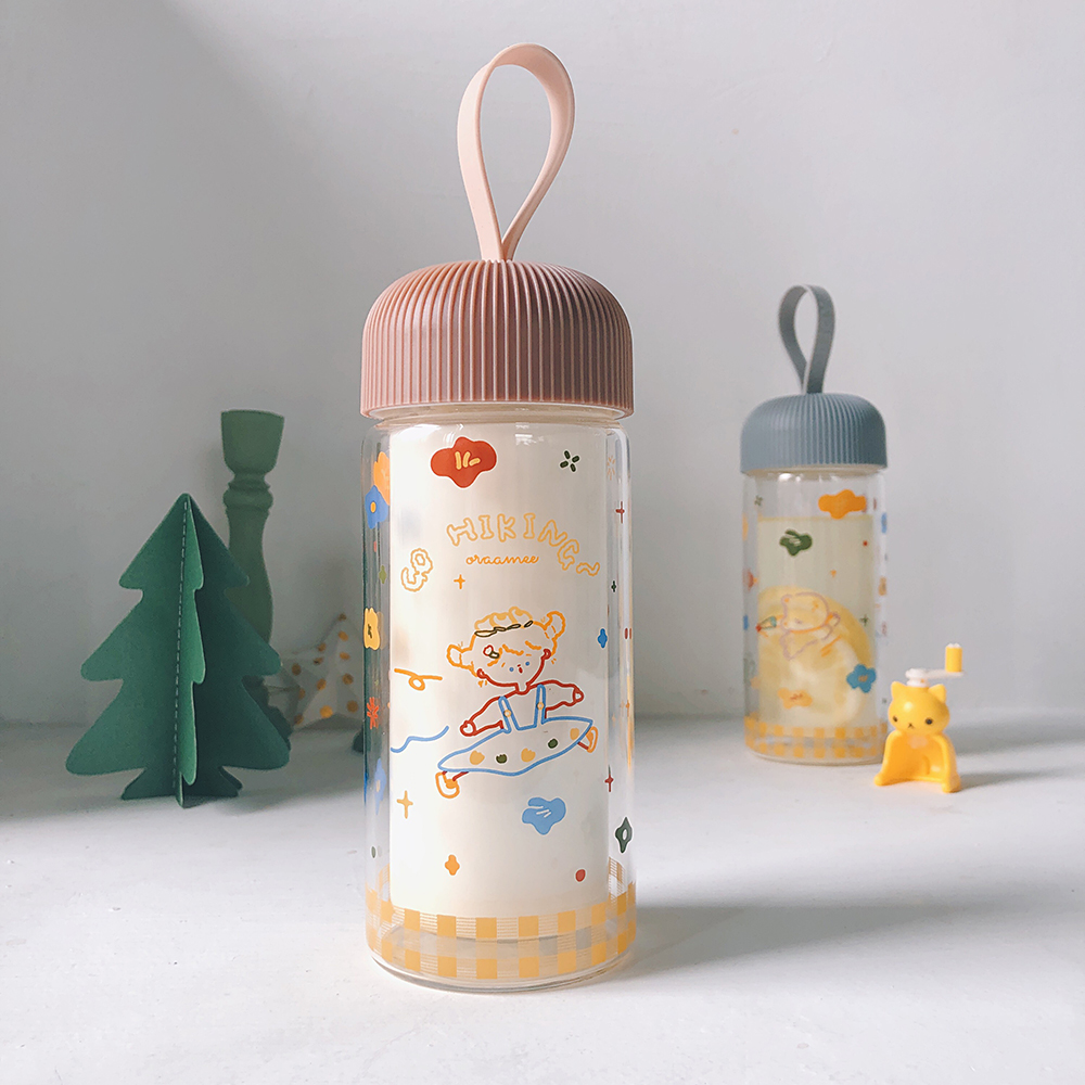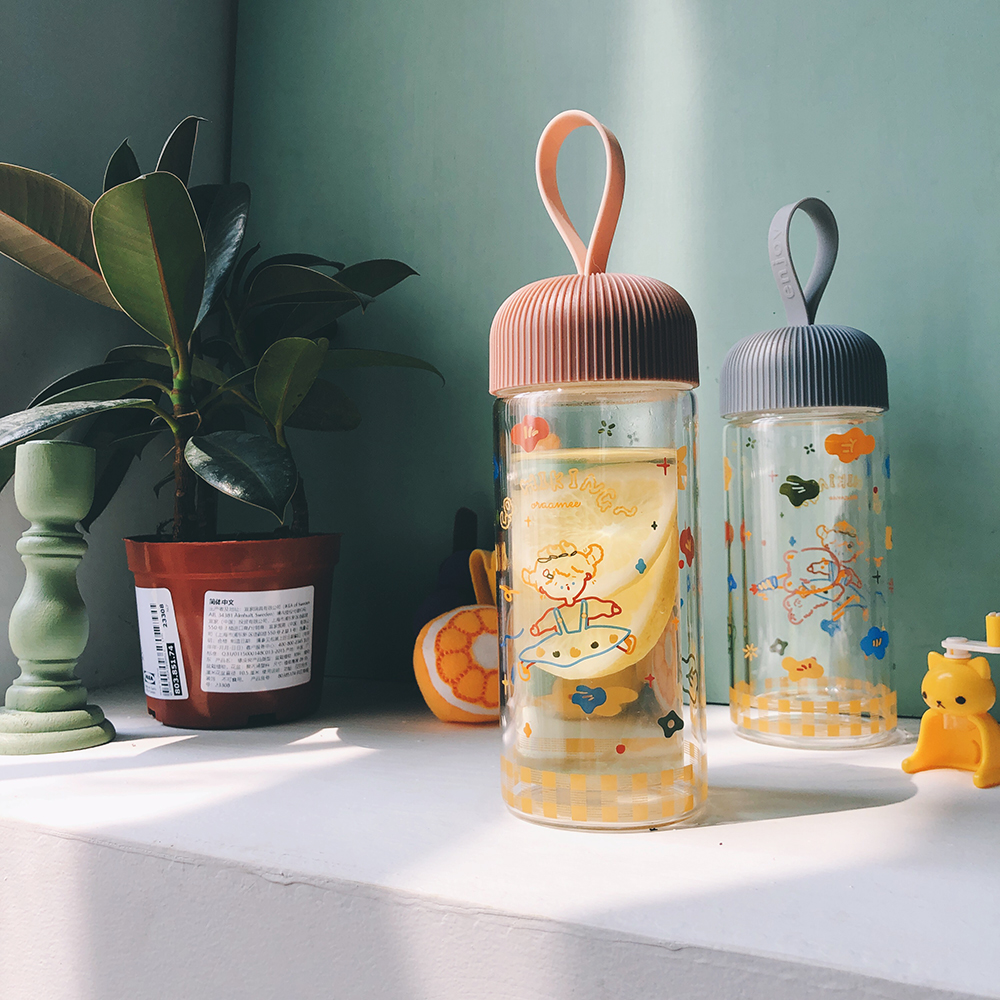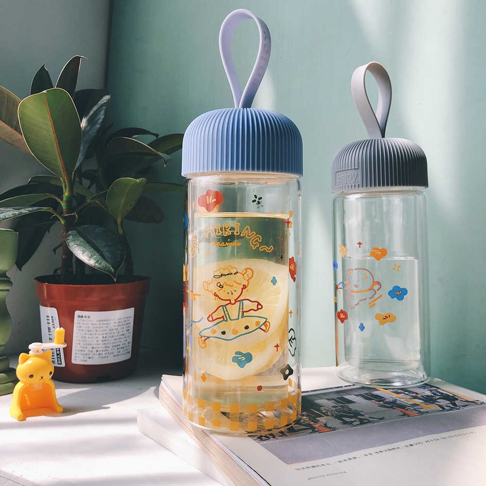 渔夫与橘鸟原创插画双层玻璃杯带提手隔热耐高温小巧清新少女花花